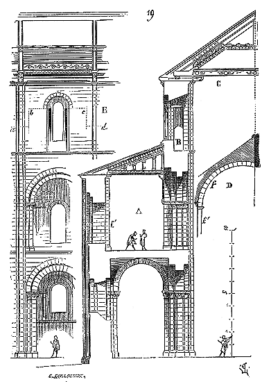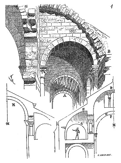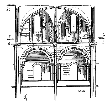 Or, ce genre de voûtes est un pas en arrière, non un progrès. Les berceaux ont une poussée continue et non répartie sur des points isolés; ils sont très-lourds, s'ils sont de pierre; leur effet n'est pas heureux, et les pénétrations des baies dans leurs reins produisent des courbes très-désagréables, que les Romains, avec juste raison, évitaient autant que faire se pouvait.