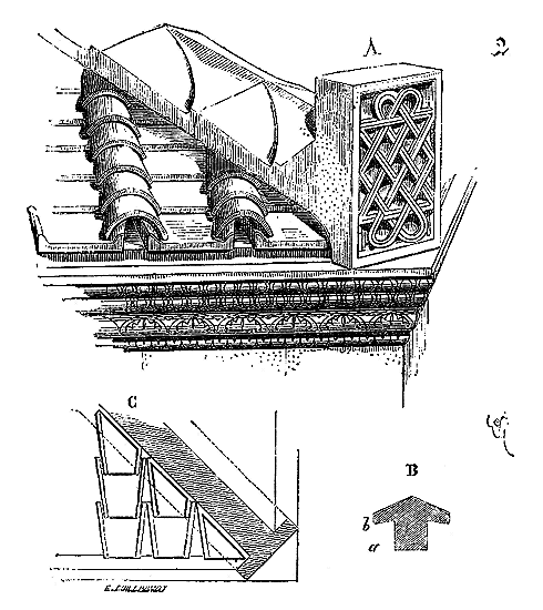 Les Anglais ont-ils fait des voûtes originairement composées d'arcs de pierre ou de courbes de bois, sur lesquelles ils auraient posé des madriers, des couchis, en un mot? C'est possible; d'autant qu'il existe encore en Angleterre, dans le cloître de la cathédrale de Lincoln, entre autres exemples, des voûtes ainsi construites et qui datent du XIVe siècle. Il ne faut pas perdre de vue que les constructions de bois ont de tout temps tenu une place importante dans l'architecture anglaise, comme dans l'architecture de toutes les races du Nord.