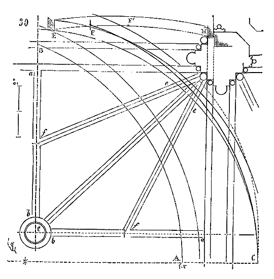 Nous présentons (fig. 30) le plan du quart de cette voûte. Au centre C est une clef en lunette pour le passage des cloches de la flèche. Les liernes sont projetées en ab, les tiercerons en ef. Ces arcs viennent se réunir au milieu des tiercerons. En AB, nous avons tracé le rabattement des arcs-doubleaux; en GE, celui des arcs ogives; en GF, celui des tiercerons, et en HE la projection verticale des liernes. On voit que les clefs de ces arcs atteignent à très-peu près le même niveau. Les liernes ont une courbure, sont bandées pour pouvoir se porter d'elles-mêmes, et reçoivent en F' la tête des tiercerons. Les rangs de moellons des voûtains n'en sont pas moins posés parallèlement aux lignes de clefs, c'est-à-dire aux liernes, et les tiercerons ne sont là qu'un nerf pour renforcer ces rangs de moellons vers le milieu de leur courbure, dont la lierne ab donne la flèche.