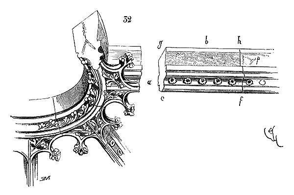 Voici (fig. 32) comme sont appareillées ces rencontres d'arcs avec la clef-oeil. La clef-oeil est composée de huit morceaux. Les quatre qui correspondent aux arcs ogives sont naturellement maintenus à leur, place par la coupe normale à l'arc; les quatre qui correspondent aux liernes sont maintenus également par une coupe oblique a, de sorte que le dernier morceau b de la lierne est plus large à l'intrados, de e en f, qu'à l'extrados, de g en h. Mais toutefois ce morceau, pas plus que ceux qui le précèdent, ne peut choir, puisqu'ils sont les uns et les autres pincés et maintenus par les triangles des remplissages, à la queue p. La figure 32 permet d'apprécier l'utilité des redents qui renforcent les arrivées des branches d'arcs et des liernes, et empêchent ainsi les ruptures qui, se produisant au collet, occasionneraient de graves désordres dans l'économie de la voûte. Comme toujours, l'élément pratique, une nécessité d'appareil ou de structure, fournit ici un motif de décoration. Il est nécessaire de nous étendre quelque peu sur le système de voûtes anglo-normand. Cette étude est intéressante, parce qu'elle fait voir comment, en partant d'un même point, d'un même principe, les deux systèmes anglais et français sont arrivés à des résultats très-différents, tout en demeurant rigoureusement fidèles l'un et l'autre à ce principe.