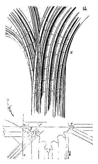 Mais nous voyons, dans la perspective figure 42, qu'entre l'arc ogive et l'archivolte, le remplissage est abandonné et pénètre dans la pile même, continuant au-dessus de la bague formant chapiteau. Il y a là un point incomplet, car les voûtains de remplissage doivent toujours reposer sur des extrados d'arcs. Au XIVe siècle, le constructeur de l'église abbatiale de Saint-Ouen de Rouen prend un parti plus franc, plus logique, bien qu'en apparence beaucoup plus compliqué (fig. 44).
