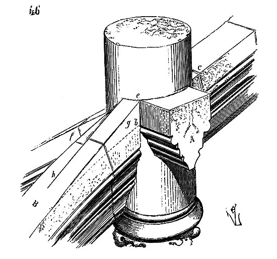 Pour sauver cette difficulté, les architectes de la renaissance tracent une clef pendante à ces points de rencontre (fig. 46) 414; clef pendante qui se compose d'un corps cylindrique dans lequel viennent pénétrer les divers arcs 415. Les arcs secondaires étant, comme les arcs principaux, posés dans un plan vertical, l'extrados de la fausse lierne A arrive horizontalement contre le corps cylindrique, tandis que l'extrados de l'arc ogive B le pénétrerait en b du côté de sa naissance, et en c du côté de son sommet; il y aurait donc une différence de niveau entre le point b et le point c. Et de b en c, comment poser les moellons de remplissage? Les constructeurs ont donc augmenté la hauteur des joues de ces arcs principaux en arrivant près de ces clefs, ainsi que l'indique le supplément g, pour araser le point e, et cela en raison du niveau de ces points d'arrivée des liernes, fausses liernes ou faux tiercerons. Il y aurait, par exemple, un décrochement en h à l'arrivée de l'arc ogive B, puisque l'extrados du faux tierceron l n'arriverait pas au niveau de l'extrados de la fausse lierne A. On voit quelles complications de coupes produisaient ces fantaisies des architectes de la renaissance, beaucoup plus préoccupés d'obtenir un effet décoratif que des conditions d'une sage construction. Si nous ajoutons à ces difficultés gratuitement accumulées le manque des connaissances du tracé géométrique, qui déjà se faisait sentir dans les chantiers, nous ne serons pas surpris du peu de durée de ces voûtes du XVIe siècle. Cependant on reconnaît que l'habitude de raisonner sur l'application des formes convenables à l'objet n'est point encore perdue chez les maîtres. Ainsi la forme allongée de ces clefs pendantes, dont l'axe est habituellement vertical, est bien motivée par ces pénétrations d'arcs à des niveaux différents. Ces longues pierres qui semblent à l'oeil des fiches plantées aux rencontres d'arcs, ne sont pas là par un caprice d'artiste, mais une nécessité de structure, et les queues tombantes plus ou moins ornées de sculptures que ces artistes leur donnent en contre-bas des arcs ne font qu'accuser la fonction de ces clefs de rencontre d'arcs.