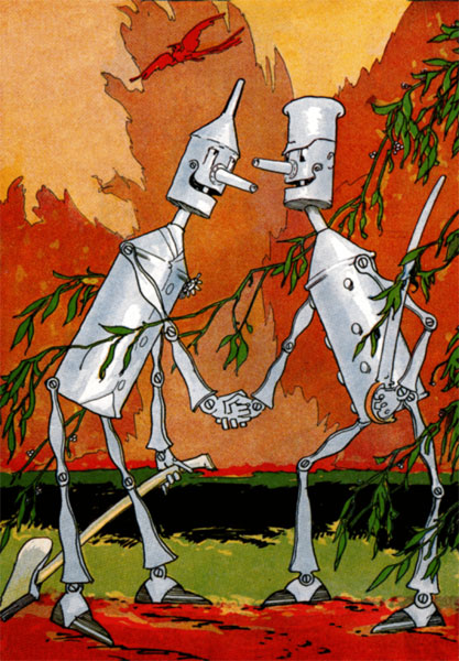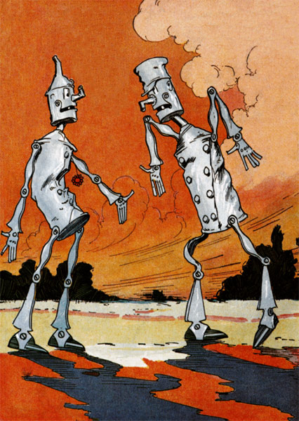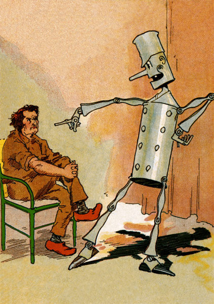 "But Nimmie Amee found me. She picked up my arms and legs and head, and made a bundle of them and carried them to the tinsmith, who set to work and made me a fine body of pure tin. When he had joined the arms and legs to the body, and set my head in the tin collar, I was a much better man than ever, for my body could not ache or pain me, and I was so beautiful and bright that I had no need of clothing. Clothing is always a nuisance, because it soils and tears and has to be replaced; but my tin body only needs to be oiled and polished.27