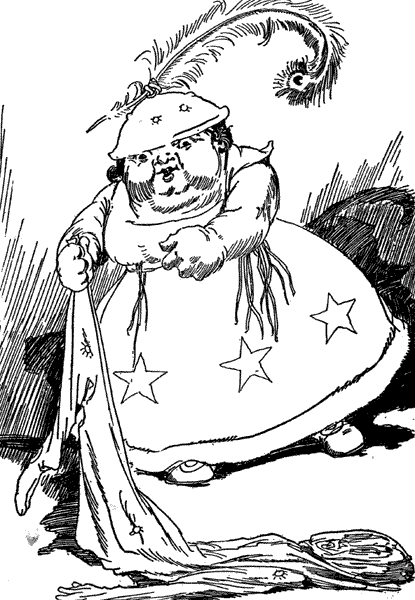 By the time Woot the Wanderer had passed through the grand corridors—all lined with ornamental tin—and under stately tin archways and16 through the many tin rooms all set with beautiful tin furniture, his eyes had grown bigger than ever and his whole little body thrilled with amazement. But, astonished though he was, he was able to make a polite bow before the throne and to say in a respectful voice: "I salute your Illustrious Majesty and offer you my humble services."