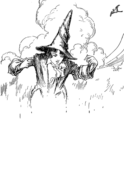 "Nimmie Amee. This girl, so fair that the sunsets blushed when their rays fell upon her, lived with a powerful witch who wore silver shoes and who had made the poor child her slave. Nimmie Amee was obliged to work from morning till night for the23 old Witch of the East, scrubbing and sweeping her hut and cooking her meals and washing her dishes. She had to cut firewood, too, until I found her one day in the forest and fell in love with her. After that, I always brought plenty of firewood to Nimmie Amee and we became very friendly. Finally I asked her to marry me, and she agreed to do so, but the Witch happened to overhear our conversation and it made her very angry, for she did not wish her slave to be taken away from her. The Witch commanded me never to come near Nimmie Amee again, but I told her I was my own master and would do as I pleased, not realizing that this was a careless way to speak to a Witch.