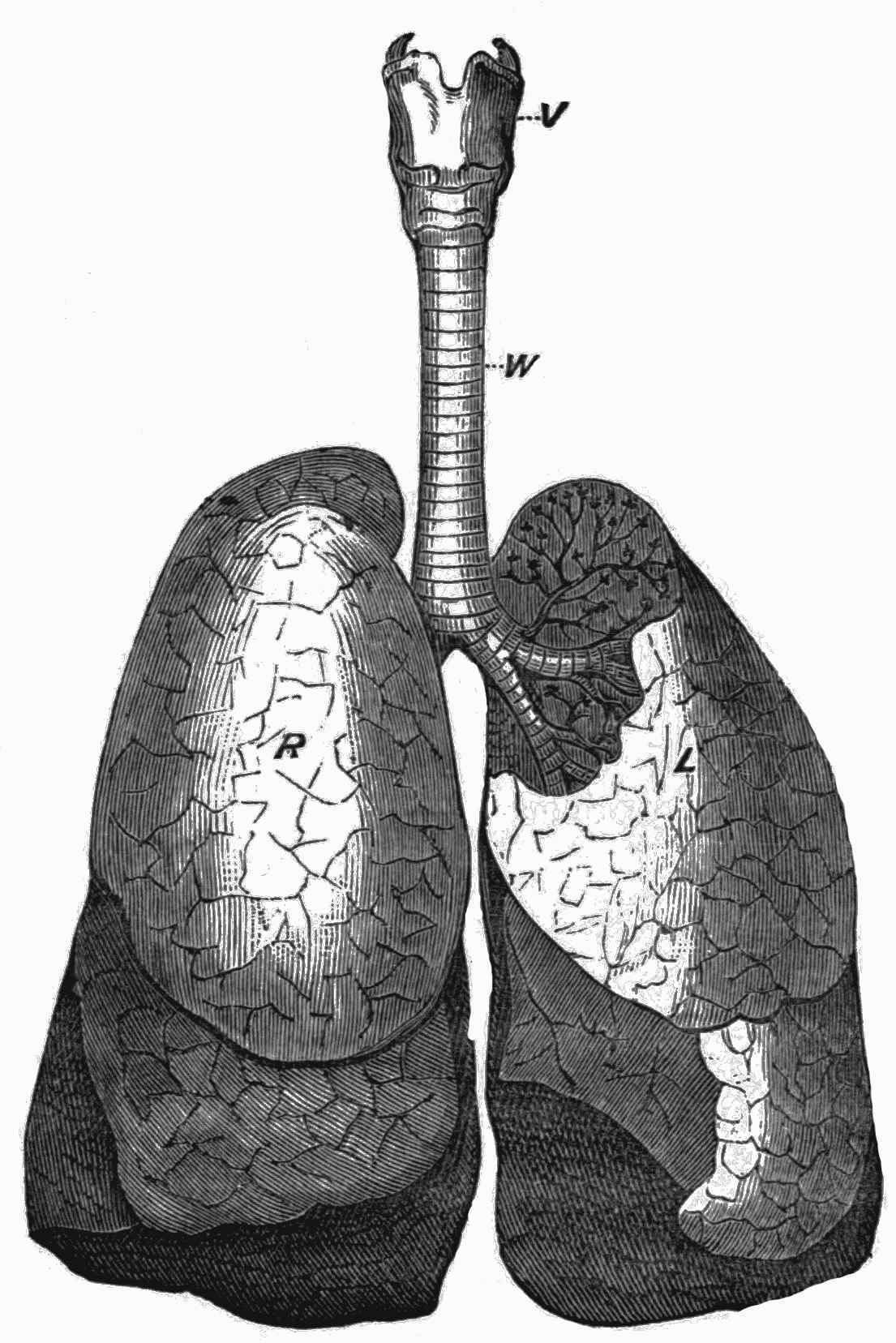 The Lungs are enclosed in the chest, which they fit exactly, and of which they occupy by far the largest portion, leaving but a small space for the heart. They consist of two halves (pl. II, R, L), each roughly resembling the upper part of a sugar-loaf somewhat flattened[12][11][10] and hollowed out at the bottom. The left shows two and the right three distinct flaps or lobes. They are only connected by means of the windpipe (pl. II, W) and its branches.
