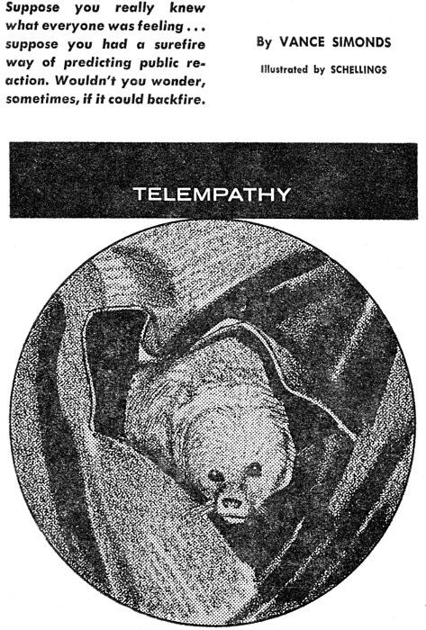 "With this device," continued Cam, "Edgar Rice Burroughs would not have to have spent weeks playing with nonsense syllables before styling his hero 'Tarzan'." He guided Ev to a specially constructed chair at the table, rolled up one sleeve, applied the clamp to his bicep. "The machine provided evaluation of alternate names on the basis of blood-pressure fluctuation. Till now, we've had to operate on the basis of a cumulative group reaction, with the obvious disadvantages of all group samples. With Everett & Associates, we may well have a single-unit, perfectly representative sounding board."