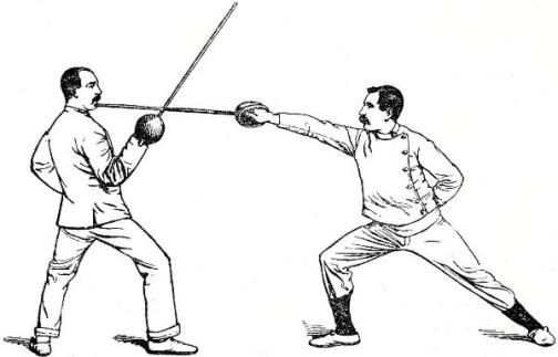 The left arm, supplying the place of the targe, alluded to in Scott’s lines, is doubtless an advantage; but, in the case of the two combatants whose merits we are considering, the ordinary swordsman possesses superior reach, can lunge out further, and knows full well the value of the point.