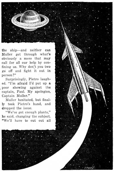 "All right, break it up!" Muller ordered. "You men get back to your work. And you, Dr. Pietro—my contract calls for me to deliver you to Saturn's moon, but it doesn't forbid me to haul you the rest of the way in irons. I won't have this aboard my ship!"