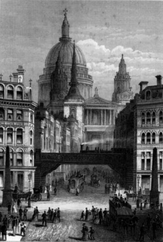 "The moon has now increased in power, and, acting on the mist, brings out the surrounding churches one by one. There they stand in the soft light, a noble army of temples thickly sprinkled amongst the money-changers. Any taste may be suited in structural design. There are high churches, low churches; flat churches; broad churches, narrow churches; square, round, and pointed churches; churches with towers like[Pg 1170] cubical slabs sunk deeply in between the roofs of houses; towers like toothpicks, like three-pronged forks, like pepper-casters, like factory chimneys, like limekilns, like a sailor's trousers hung up to dry, like bottles of fish-sauce, and like St. Paul's—a balloon turned topsy-turvy. There they stand, like giant spectral watchmen guarding the silent city, whose beating heart still murmurs in its sleep. At the hour of midnight they proclaim, with iron tongue, the advent of a New Year, mingling a song of joy with a wail for the departed....