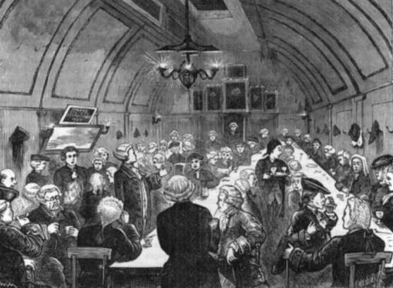"Such were the reflections which naturally arose while I sat at the 'Boar's Head Tavern,' still kept at Eastcheap. Here, by a pleasant fire, in the very room where old Sir John Falstaff cracked his jokes, in the very chair which was sometimes honoured by Prince Henry, and sometimes polluted by his immortal merry companions, I sat and ruminated on the follies of youth, wished to be young again, but was resolved to make the best of life whilst it lasted, and now and then compared past and present times together. I considered myself as the only living representative of the old knight, and transported my imagination back to the times when the Prince and he gave life to the revel. The room also conspired to throw my reflections back into antiquity. The oak floor, the Gothic windows, and the ponderous chimney-piece had long withstood the tooth of time. The watchman had gone twelve. My companions had all stolen off, and none now remained with me but the landlord. From him I could have wished to know the history of a tavern that had such a long succession of customers. I could not help thinking that an account of this kind would be a pleasing contrast of the manners of different ages. But my landlord could give me no information. He continued to doze and sot, and tell a tedious story, as most other landlords usually do, and, though he said nothing, yet was never silent. One good joke followed another good joke; and the best joke of all was generally begun towards the end of a bottle. I found at last, however, his wine and his conversation operate by degrees. He insensibly began to alter his appearance. His cravat seemed quilted into a ruff, and his breeches swelled out into a farthingale. I now fancied him changing sexes; and as my eyes began to close in slumber, I imagined my fat landlord actually converted into as fat a landlady. However, sleep made but few changes in my situation. The tavern, the apartment, and the table continued as before. Nothing suffered mutation but my host, who was fairly altered into a gentlewoman, whom I knew to be Dame Quickly, mistress of this tavern in the days of Sir John; and the liquor we were drinking seemed converted into sack and sugar.