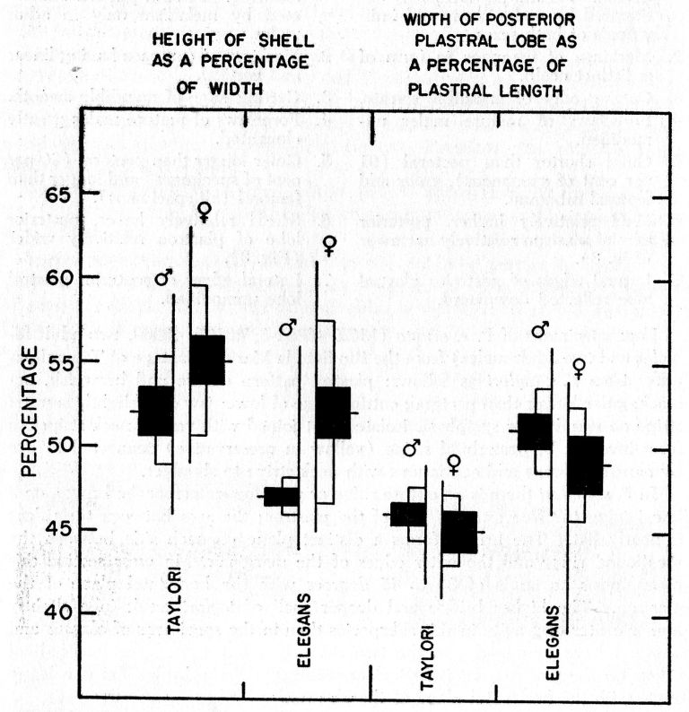 Fig. 3. Relative height of shell (expressed as a percentage of width) and relative width of posterior plastral lobe (expressed as a percentage of plastral length) in two subspecies of Pseudemys scripta. The data presented are for 62 specimens (40 ♀, 22 ♂) of P. s. taylori and 37 specimens (13 ♀, 24 ♂) of P. s. elegans. Horizontal and vertical lines represent the mean and range, respectively, whereas open and solid rectangles represent one standard deviation and two standard errors of the mean, respectively.