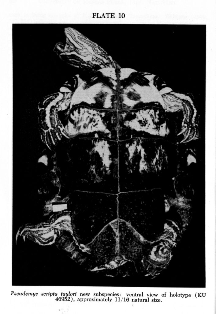 Three specimens of Pseudemys scripta obtained by Robert G. Webb in the Río Chiquito at a point 8 mi. W of Nadadores, 2100 ft., where the river flows out of the basin of Cuatro Ciénegas, have many characteristics in common with taylori, but resemble elegans closely in several characters as follows: no extensive melanism; plastral markings tending to be brownish; anterior plastral markings smudgelike, isolated or nearly isolated; markings on lateral scutes tending to have vertical, linear arrangement; cutting edge of mandible weakly serrate; femoral edges of plastron not reflected ventrally; one or more fine, pale lines between two major stripes on antebrachium; gular longer than pectoral in one specimen, longer than femoral in both specimens. The nature of these specimens suggests that parts of the Río Salado drainage north and east of Cuatro Ciénegas are in a zone of intergradation between taylori and elegans. I have examined what I consider to be typical examples of P. s. [Pg 78] elegans from the region of Múzquiz (CNHM 28843-45, 55625-45), and from Don Martín Reservoir (KU 33524). These localities are, respectively, approximately 70 miles north-northeast and 100 miles east-northeast of Cuatro Ciénegas. The specimens from Múzquiz are presumably the same that Carr (1952:262) treated as "... elegans-cataspila intergrades, but with a strong leaning toward eastern elegans...." Populations of P. scripta in central eastern Coahuila (between the above-mentioned localities and Cuatro Ciénegas) probably are a conglomerate of only two subspecies (elegans and taylori), not including gaigeae (as was suggested by Hamilton, 1947:65 and by Carr, op. cit.:241, map 17;262).