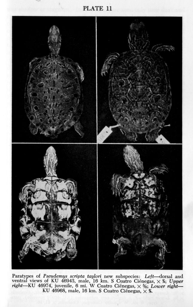 Remarks.—Local names for the above-mentioned localities in the basin of Cuatro Ciénegas are as follows: Anteojo (6 mi. W Cuatro Ciénegas); El Mojarral (8.5 mi. SW); and Ojo de Agua de Tío Candido, on Rancho Orozco (16 km. S). The Río Chiquito is referred to by some natives as "Río Colorado" and by some as "Río Salado." The local name for P. s. taylori is tortuga negra (the name is used also for Terrapene coahuila).