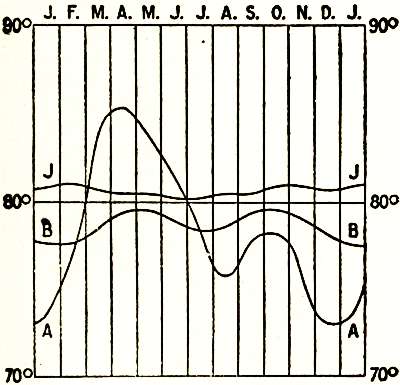 At the equator, where the day is always twelve hours long, there are two maxima of insolation at the equinoxes, when the sun is vertical at noon, and two minima at the solstices when the sun is farthest off the equator. The values do not vary much through the year because the sun is never very far from the zenith, and day and night are always equal. As latitude increases, the angle of insolation becomes more oblique and the intensity decreases, but at the same time the length of day rapidly increases during the summer, and towards the pole of the hemisphere which is having its summer the gain in insolation from the latter cause more than compensates for the loss by the former. The double period of insolation above noted for the equator prevails as far as about lat. 12° N. and S.; at lat. 15° the two maxima have united in one, and the same is true of the minima. At the pole there is one maximum at the summer solstice, and no insolation at all while the sun is below the horizon. On the 21st of June the equator has a day twelve hours long, but the sun does not reach the zenith, and the amount of insolation is therefore less than at the equinox. On the northern tropic, however, the sun is vertical at noon, and the day is more than twelve hours long. Hence the amount of insolation received at this latitude is greater than that received on the equinox at the equator. From the tropic to the pole the sun stands lower and lower at noon, and the value of insolation would steadily decrease with latitude if it were not for the increase in the length of day. Going polewards from the northern tropic on the 21st of June, the value of insolation increases for a time, because, although the sun is lower, the number of hours during which it shines is greater. A maximum value is reached at about lat. 43½° N. The decreasing altitude of the sun then more than compensates for the increasing length of day, and the value of insolation diminishes, a minimum being reached at about lat. 62°. Then the rapidly increasing length of day towards the pole again brings about an increase in the value of insolation, until a maximum is reached at the pole which is greater than the value received at the equator at any time. The length of day is the same on the Arctic circle as at the pole itself, but while the altitude of the sun varies during the day on the former, the altitude at the pole remains 23½° throughout the 24 hours. The result is to give the pole a maximum. On the 21st of June there are therefore two maxima of insolation, one at lat. 43½° and one at the north pole. From lat. 43½° N., insolation decreases to zero on the Antarctic circle, for sunshine falls more and more obliquely, and the day becomes shorter and shorter. Beyond lat. 66½° S. the night lasts 24 hours. On the 21st of December the conditions in southern latitudes are similar to those in the northern hemisphere on the 21st of June, but the southern latitudes have higher values of insolation because the earth is then nearer the sun.