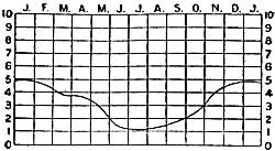 The relative amounts of insolation received at different latitudes and at different times have been carefully determined. The values all refer to conditions at the upper limit of the earth’s atmosphere, i.e. without the effect of absorption by the atmosphere. The accompanying figure (fig. 1), after Davis, shows the distribution of insolation in both hemispheres at different latitudes and at different times in the year. The latitudes are given at the left margin and the time of year at the right margin. The values of insolation are shown by the vertical distance above the plane of the two margins.