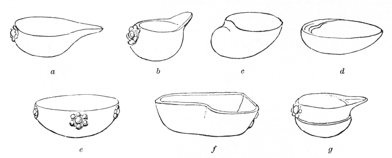 Compound vessels are rather rare, nearly all of the varieties being outlined in Fig. 428. Some of these are formed by uniting two or even three simple forms in one. Others are only partially compound and resemble the askoidal shapes of Greek art. Attention will be called to the probable origin of all these shapes elsewhere.