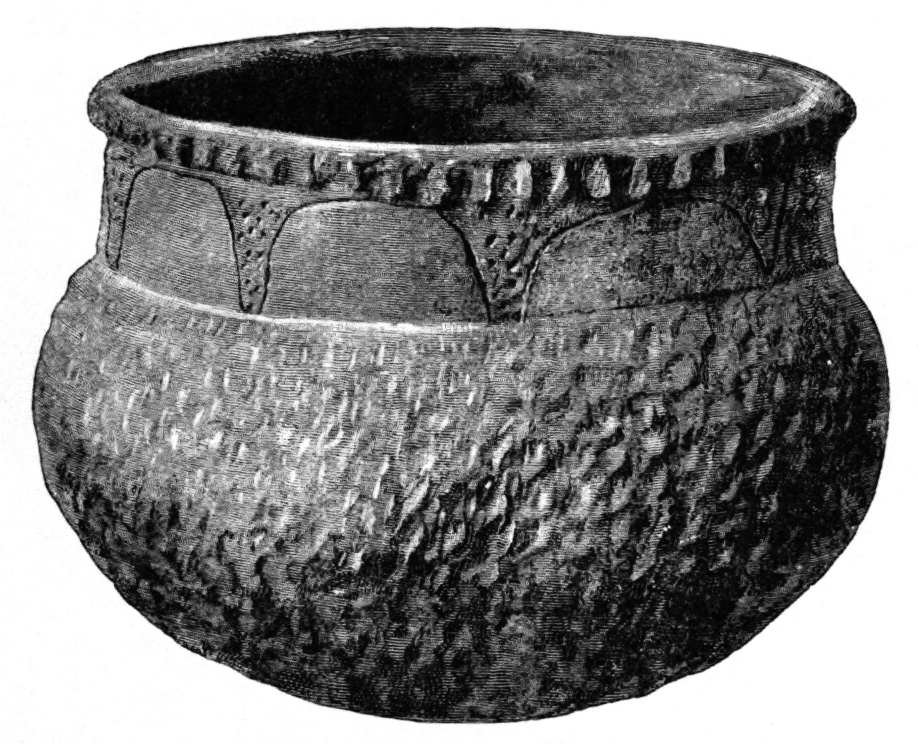 There is a broad, shallow constriction at the neck. The walls are from one-fourth to three-eighths of an inch thick, and the margin of the rim is squared off, showing the full thickness—a strong characteristic of the northern pottery. The form is nearly symmetrical, and the surface is hand-smoothed but not polished. The paste is now dark and crumbling, and shows a rough fracture. A large percentage of sand was used in tempering. The color is a dark gray-brown. The [page 428] entire surface, with the exception of a narrow band about the base, has been covered with ornamentation. This is executed with considerable care, and shows a great deal of ingenuity and some taste. There is apparently no feature copied from nature or from ideographic art. Two or three distinct implements have been used. A part of the neck ornament was made by rolling back and forth a circular tool, a roulette, the edge of which was notched. A row of indented nodes has been produced upon the exterior surface of the neck by impressing upon the inside the end of a reed or hollow bone about one-fourth of an inch in diameter. Patterns of bold, rather carelessly drawn lines cover the body and seem to have been made by trailing, under pretty strong pressure, the smooth point of a stylus—probably the bone or reed already suggested. Some of the larger indentations upon the lower part of the neck may have been made by the same implement held in an oblique position. The use to which this vessel was applied can hardly be guessed. It was found with the remains of its owner, and probably contained food or drink.