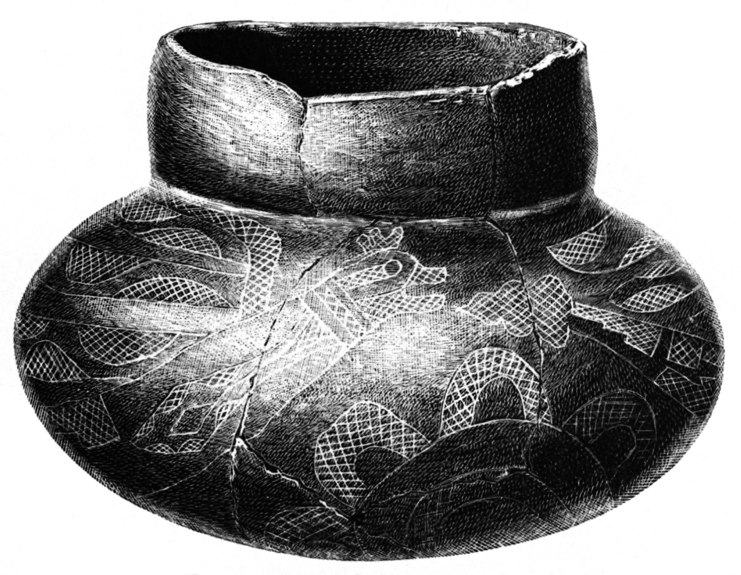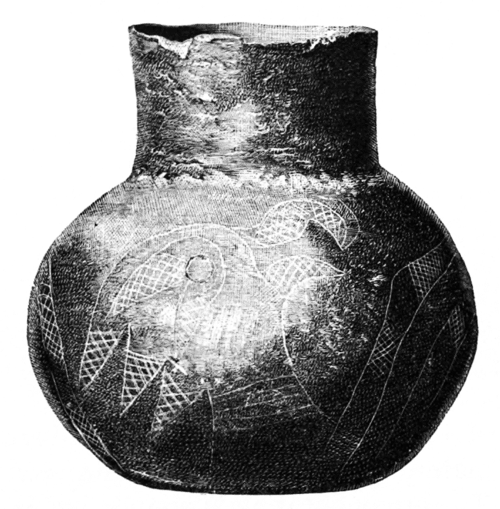 The color is dark and shows the usual fire mottlings. There is no admixture of shell material, finely pulverized micaceous matter appearing in its place. The ornamentation is simple, but is applied in a way to greatly enhance the beauty of the vessel. It consists of a single broad zone of incised figures. Three zigzag lines meander the middle [page 432] of the band and the intervening triangles are filled in with groups of straight lines. All the lines are well drawn and appear to have been cut with a sharp point in the dry clay.