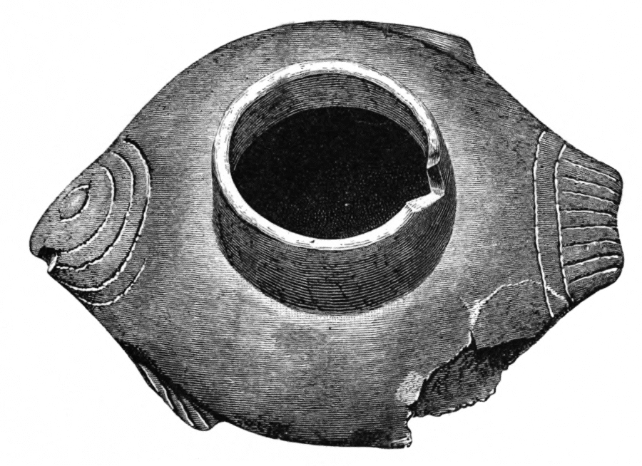 In connection with the teapot-like vessels it will be well to describe another novel form not wholly unlike them in appearance, an example [page 404] being shown in Fig. 414. The shoulder is elongated on opposite sides into two curved, horn-like cones, which give to the body a somewhat crescent-shaped outline. It is of the ordinary plain, dark ware, and has had a low stand or base which is now broken away.