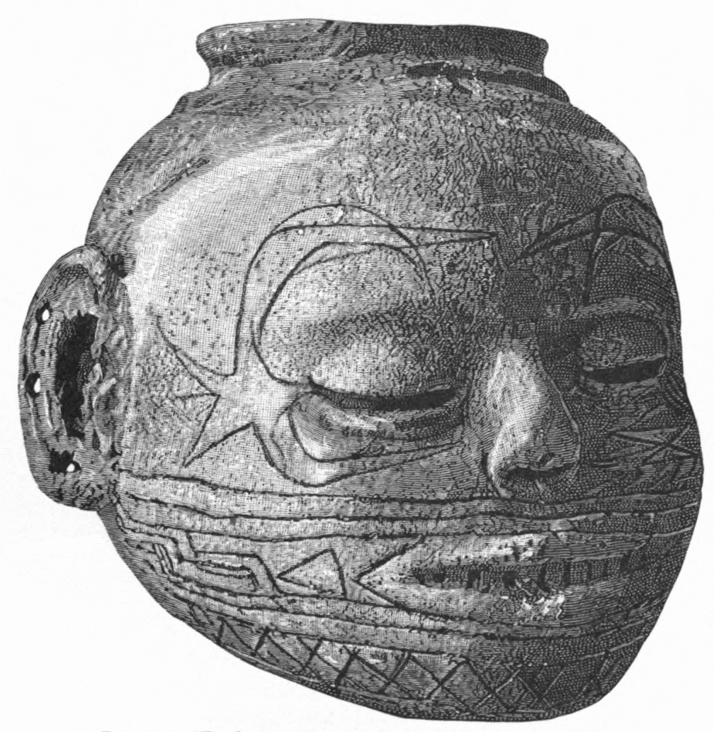 It is not strange that a people who had successfully engaged in the modeling of life forms, and especially the heads of animals, should attempt the human head. Their remarkable success in this direction is shown in a number of vases, one of which is given in Fig. 420. This and kindred peoples had made considerable progress in carving in stone and other materials, evincing a decided talent for sculpture; but clay is so much more readily manipulated than either wood, stone, or shell, that we are not surprised to find their best work in that material.