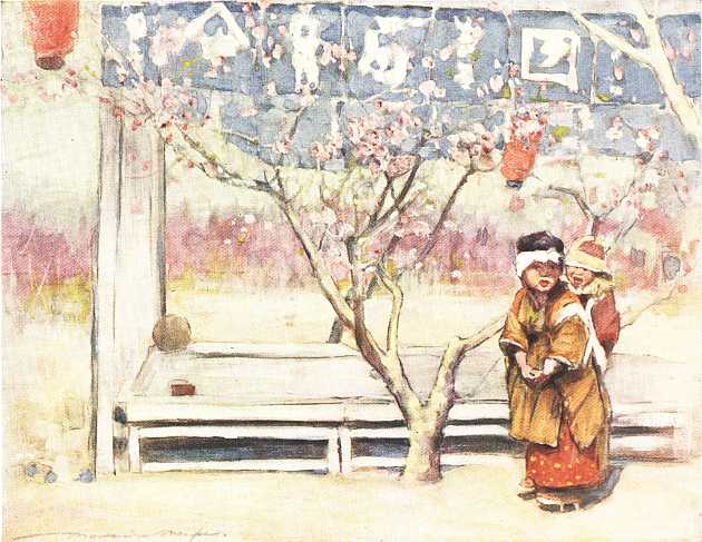 Another game in which both the youth and the age of Japan play equal parts is the game of painting sand-pictures on the roadside. These sand-pictures are often executed by very clever artists; but I have seen little children drawing exquisite pictures in coloured sands. Japanese children seem to have an instinctive knowledge of drawing and a facility in the handling of a paint-brush that is simply extraordinary. They will begin quite as babies to practise the art of painting and drawing, and more especially the art of painting sand-pictures. You will see groups of little children sitting in the playground of some ancient temple, each child with three bags of coloured sand and one of white, competing with one another as to who shall draw the quaintest and most rapid picture. The white sand they will first proceed to spread upon the ground in the form of a square, cleaning the edges until it resembles a sheet of white paper. Then, with a handful of black sand held in the chubby fingers, they will draw with the utmost rapidity the outline of some grotesque figure of a man 145 or an animal, formed out of their own baby imaginations. Then come the coloured sands, filling in the spaces with red, yellow, or blue, according to the taste and fancy of the particular child artist. But the most extraordinary and most fascinating thing of all is to watch the performance of a master in sand-pictures. So dexterous and masterly is he that he will dip his hand first into a bag of blue sand, and then into one of yellow, allowing the separate streams to trickle out unmixed; and then with a slight tremble of the hand these streams will be quickly converted into one thin stream of bright green, relapsing again into the streams of blue and yellow at a moment’s notice. A Japanese mother will take infinite pains to cultivate the artistic propensities of her child, and almost the first lesson she teaches it is to appreciate the beauties of nature. She will never miss the opportunity of teaching the infant to enjoy the cherry-blossom on a sunny day in Uyeno Park. Hundreds of such little parties are to be seen under the trees enjoying the blossom, while the mother, seated in the middle of the group, points out the many beauties of the scene. She will tell them dainty fairy stories—to the boys, brave deeds of valour, to strengthen their courage; to the girls, tales of unselfish and honourable wives and mothers. Every story has a moral attached to it, and is intended to educate and improve the children in one direction or another. There is one fairy story which is a universal favourite with both mothers and children, and that is the story of Momotaro. When seeing a mother 146 talking earnestly to her children, I have always discovered that it was the same old story, old yet ever fresh. It is a curiously simple tale about an old woman who goes every day to the river to wash clothes, and an old man who goes to the mountain to fetch wood. The old woman is always unhappy because she has no children, and one day, when she is washing clothes in the river, a large peach comes floating down towards her. On carrying it home, she hears the cry of a child, which appears to come from the inside of the peach. She rapidly cuts it in two, and finds to her amazement a fine baby sitting in the middle of it, which, since it was born in a peach, she afterwards called Momotaro. The story then goes on to tell how the baby grows up to be a fine healthy lad, who, on reaching the age of seventeen, plans an expedition to subjugate an island of the devil. A minute description is given of the food he takes with him—of the corn and rice wrapped in a bamboo leaf—and how on his journey he meets with a wasp, a crab, a chestnut, and a millstone, who all promise to help him if he will give them half of his food. The lad complies, and a beautiful description is given of their journey to the island of the devil, on which journey a very skilful plan is thought out by which to kill him. On arriving at the island, they find that the chief of the devils is not in his own room. They soon take advantage of his absence. The chestnut hops into the ash; the millstone mounts on to the roof; the crab hides in the washing-pan; the wasp settles in a corner; and 147 the lad waits outside. The poor devil comes back, and has a terrible time between them all. He goes to the fireplace to warm his hands; the chestnut cracks in the fire and burns them; he rushes to the water-pan to cool himself, and the crab bites his hand; he flies to a safe place, and is tormented by the wasp; in an agony of pain he tries to leave the room, but the remorseless millstone descends with a crash upon his head, and mortally wounds him. This story is told to the Japanese children over and over again, but is always received with wide-eyed delight and excitement.