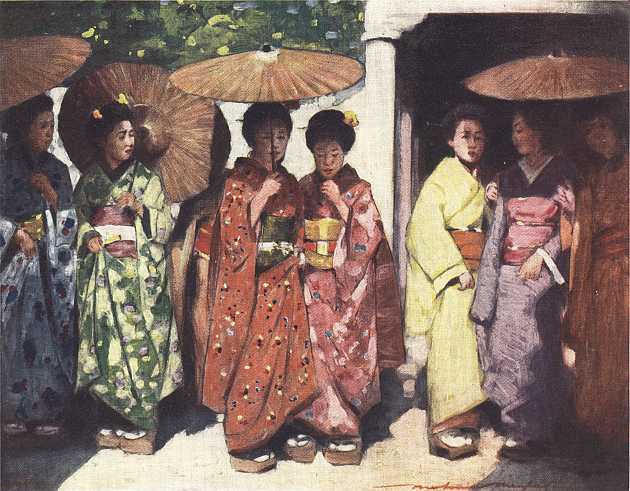 Patriotism is a strong trait in the character of the Japanese; but perhaps their imagination and their love of Nature are even stronger, and at all events will cause them to bound forward and become a first-rate power. This universal force of the imagination is a quality that no other nation possesses, and it is a quality that will cause her, not so very many years hence, to dominate the world. All the Japanese possess imagination, from the highest to the lowest; it is shown in every action and detail of their daily 205 life. There is no one of them, even to the poorest coolie, who has not some little collection of exquisite works of the art that he loves. Your jinricksha man, if you were ever allowed the privilege of visiting his house, would in all probability be able to show you one or two choice specimens, either in china or in bronze, of his household gods. And so strongly is the love of Nature impressed within him that he cannot pass a beautiful scene—a hillside of blossom, or a sunset—without stopping his ricksha to allow you also the privilege of enjoying it. Often when taking a drive in the country he will suddenly stop in front of some delightful scene, put down your ricksha, and, taking from his kimono sleeve a little roll of rice, wrapped in a dainty bamboo leaf, will sit down and begin to eat it with his chopsticks, continuing to gaze at the scene, every now and then looking up at you for sympathy. If you are an artist, and will look at the scene intelligently and appreciatively, this little ricksha man will be your slave for life and will do anything for you.
