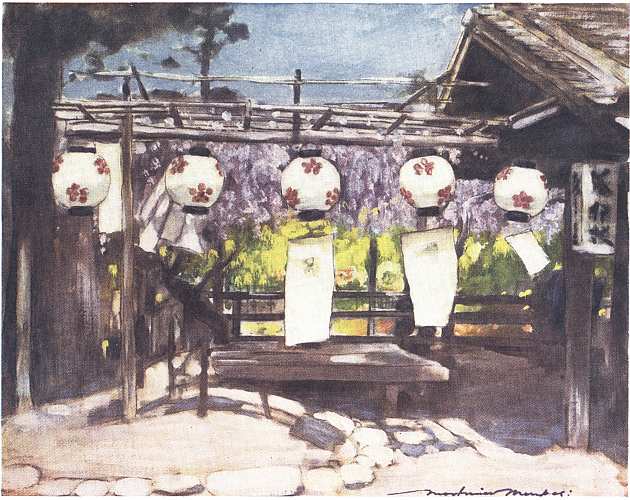 I remember once passing a temple, an ancient Shinto temple called “Kamogamo”; it was a sacred temple and very popular, being much frequented for picnics. On this particular day there was going on one of the two important picnics or festivals of the year; the great ground of the temple and the playground were enclosed about with straw ropes on bamboo poles, to separate one from another. It was a festival for girls under ten, and there were hundreds of children, all with their kimonos tucked up, showing their scarlet petticoats, and looking for all the world like a mass of 149 poppies. The scarlet in the petticoats was universally repeated in neck and hair; but their kimonos varied much, and were of almost every shade and texture of Japanese cloth and silk crepe imaginable. There were luminous greens, fawns, stripes, golden browns shading into lemon-yellows, harmonies in brown and violet, and dresses striped and chequered in tones of almost every conceivable value. Two rows or armies of these girls were placed several yards distant from each other in this long emerald-green field; and in the space between them stood two servants, each holding a long bamboo pole, fresh and green, being evidently just cut down for the fair, and suspending from its top a flat shallow drum covered with tissue paper. Presently two young men teachers appeared on the scene carrying two baskets of small many-coloured balls, which they threw down on the grass between the children and the drums. Then a signal was given, and all the girls started running down the field at full tilt towards one another, pouncing on the balls as they ran, and throwing them with all their force up at the paper drums. The great majority of them missed their aim altogether, and flew either above or below the drums, some of the mites getting so excited that they threw the balls forty or fifty yards in mid air. After a time, when a perfect shower of balls had passed through the tissue drums, quite demolishing them, a shower of coloured papers, miniature lanterns, paper umbrellas, and flags came slowly fluttering down among the children on to their jet-black bobbing heads, and into 150 their eager outstretched hands. Never have I seen anything more beautiful than these gay, brightly-clad people, packed closely together like a cluster of flowers in the brilliant sparkling sunshine, with their pretty upturned faces watching the softly falling rain of coloured toys. I strolled through the temple grounds, passed this brilliant stream of colour and lovely laughing children, passed the cherry-trees and dainty tea-houses, and in a few minutes found myself in a cool grey-green forest of bamboo, an academic bamboo grove looking like a pillared temple, sunless and silent. It was here that the philosophers of old taught and meditated, and it seemed a place to meditate in—so quiet, so sombre, shut off from the world with its endless lofty pillars of grey luminous green—silent, a world apart.