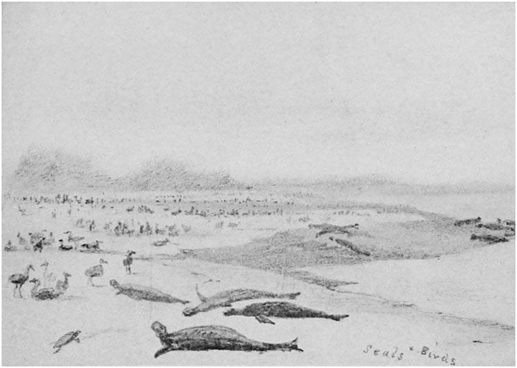 These seal are quite different from the [33]Alaska fur seal, of such great value for their fur. These have a short lustreless hair, and their principal value is in the oil that is extracted by the few seal hunters who seek them. They frequently exceed two hundred pounds in weight, and are savage fighters if one can judge by the many scars found upon them. We never thought, when, a few months ago, we amused ourselves on the verandas of the Cliff House at San Francisco in watching their disporting about Seal Rock, that we should make such a close acquaintance with them.