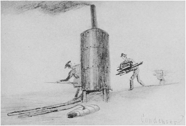 Evening. The reef party returned at sundown, reporting a strenuous day on the wreck. We all had a supper of "scouse" (a dish of pork, potato, and hard tack), and before sleeping the camp site was laid out, the sails and awnings which had come on shore temporarily set up, to our greater comfort. Besides the sails and awnings, more food supplies were captured from the after storeroom and a particularly fortunate prize secured in a small portable boiler that had been lashed to the after deck. This had been used by the contractor's party in hoisting to the scow the [36]blasted coral from the reef, at Midway Islands. There were also in one of the wheelhouses of the wreck some distilling-coils, which the engineer's force with our chief engineer successfully rescued after hard labor, for the sea was washing through the wheelhouse with terrible force. The boiler, suspended between two boats, was successfully landed on the beach, and we are greatly encouraged at the promise of fresh water to-morrow. We secured a barrel, also, partly filled with sperm oil, and a lantern in good condition. These two articles insure us a supply of lighting material for the cooking-fire, which can now be put out at night and much fuel saved. Considerable clothing was secured from the officers' staterooms, and I was fortunate enough to find some of mine rolled up in one of the large wet bundles; and a few soaked mattresses and blankets were also brought in. The carpenter's chest, too, [37]came ashore intact, and altogether we feel our situation greatly improved.