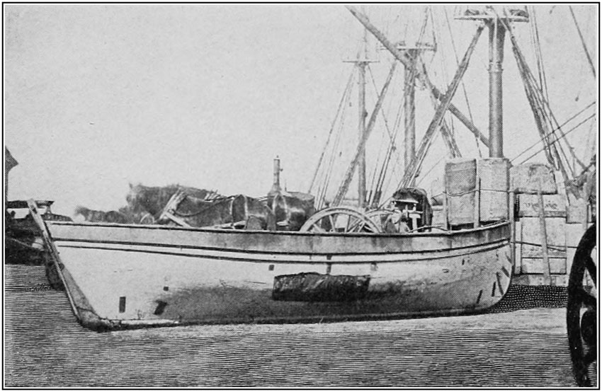 A few of the more frightened ones had at [24]first, either through a misunderstanding or otherwise, rushed to our largest boat—the launch—hanging at the starboard quarter and partly lowered it before the act was noticed. A large combing sea came along and tore it from their hold, smashing it against the side of the ship and then carrying its remnants away with its tackles and all its fittings. This was a great loss, we felt, if we should have to take to the boats, for we did not know at that time where we were. The same wave also carried off one of the crew, a member of the Marine Guard, who had been on the bulwarks; and whisking him seaward, returned him miraculously around the stern of the ship to the reef, where his struggles and cries attracted the notice of others. He was hauled over the lee side, somewhat bruised and water-soaked, but, judging from his remarks, apparently not realizing his wonderful escape from death.