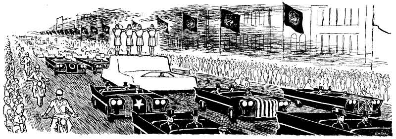 Quite suddenly the aliens left the Northwest, and accompanied by protective squads of FBI and Secret Service began to cross the nation. Taking widely separated paths they visited cities, towns, and farms, exhibiting the greatest curiosity about the workings of human civilization. And, in turn, they were examined by hordes of hopeful humans. Everywhere they went, they spread their message of good will and hope backed by the incredibly convincing power of their telepathic minds. Behind them, they left peace and hopeful calm; before them, anticipation mounted. It rose to a crescendo in New York where the paths of the star men met.