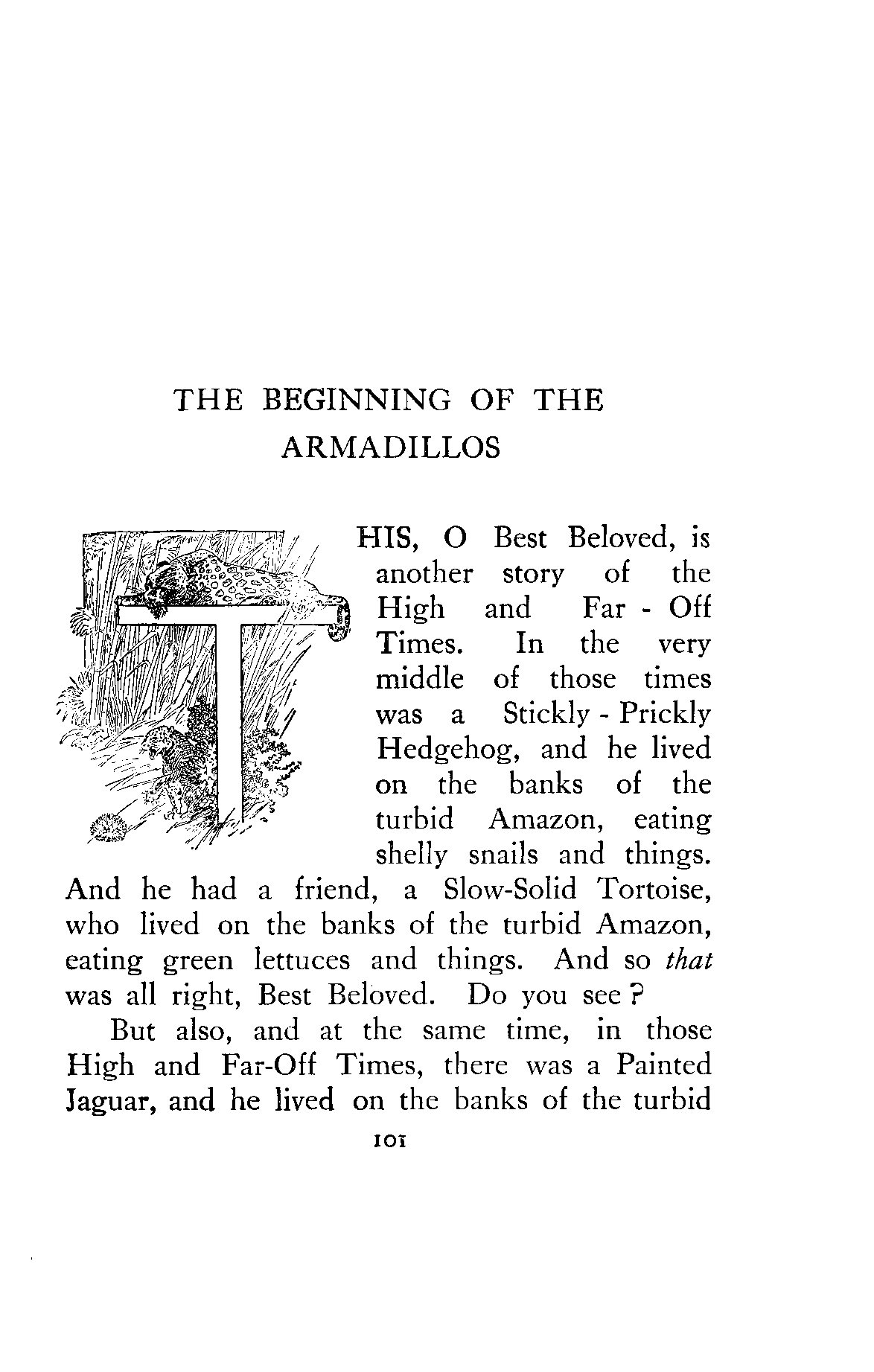 In the beginning of years, when the world was so new and all, and the Animals were just beginning to work for Man, there was a Camel, and he lived in the middle of a Howling Desert because he did not want to work; and besides, he was a Howler himself. So he ate sticks and thorns and tamarisks and milkweed and prickles, most 'scruciating idle; and when anybody spoke to him he said 'Humph!' Just 'Humph!' and no more.[16]