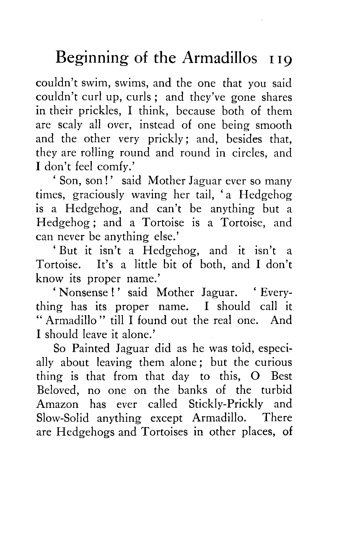 "Just So Stories," have also been copyrighted separately as follows: How the Whale Got His Tiny Throat. Copyright, 1897, by the Century Company. How the Camel Got His Hump. Copyright, 1897, by the Century Company. How the Rhinoceros Got His Wrinkly Skin. Copyright, 1898, by the Century Company. The Elephant's Child. Copyright, 1900, by Rudyard Kipling; Copyright, 1900, by the Curtis Publishing Company. The Beginning of the Armadillos. Copyright, 1900, by Rudyard Kipling. The Sing Song of Old Man Kangaroo. Copyright, 1900 by Rudyard Kipling. How the Leopard Got His Spots, Copyright, 1901, by Rudyard Kipling. How the First Letter Was Written. Copyright, 1901, by Rudyard Kipling. The Cat That Walked by Himself, Copyright, 1902, by Rudyard Kipling.