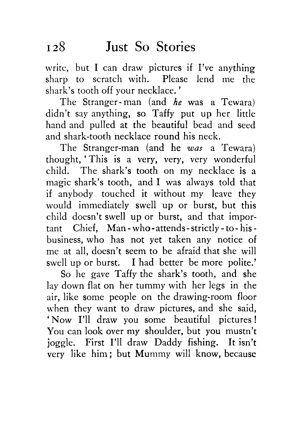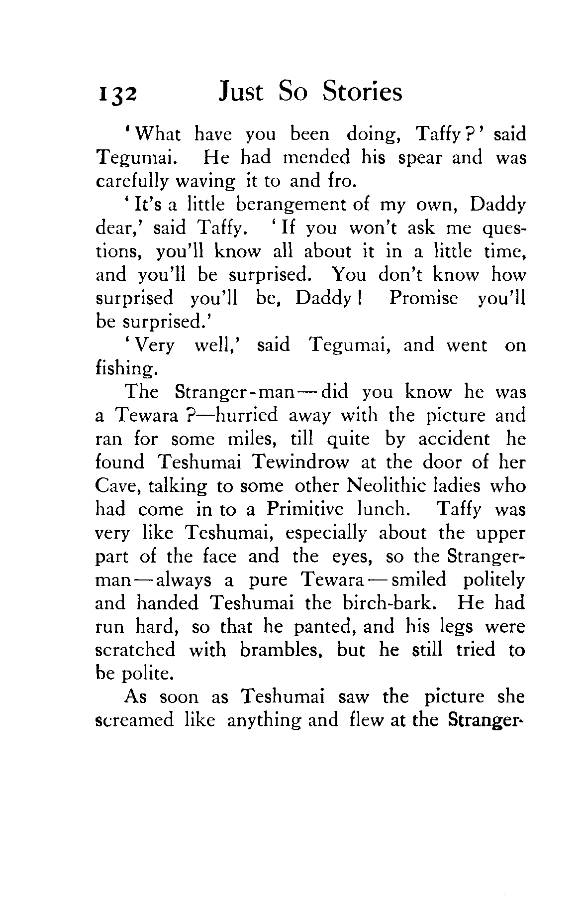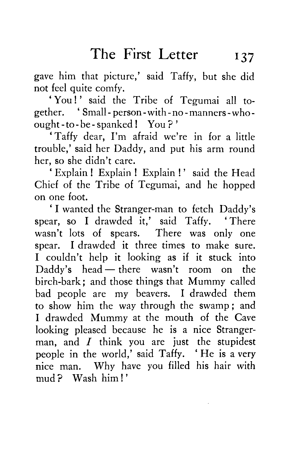 'Not when I am near,' said the Man. 'If you had not said that last I would have put all these things away for always and always and always; but I am now going to throw my two boots and my little stone axe (that makes three) at you whenever I meet you. And so shall all proper Men do after me!'