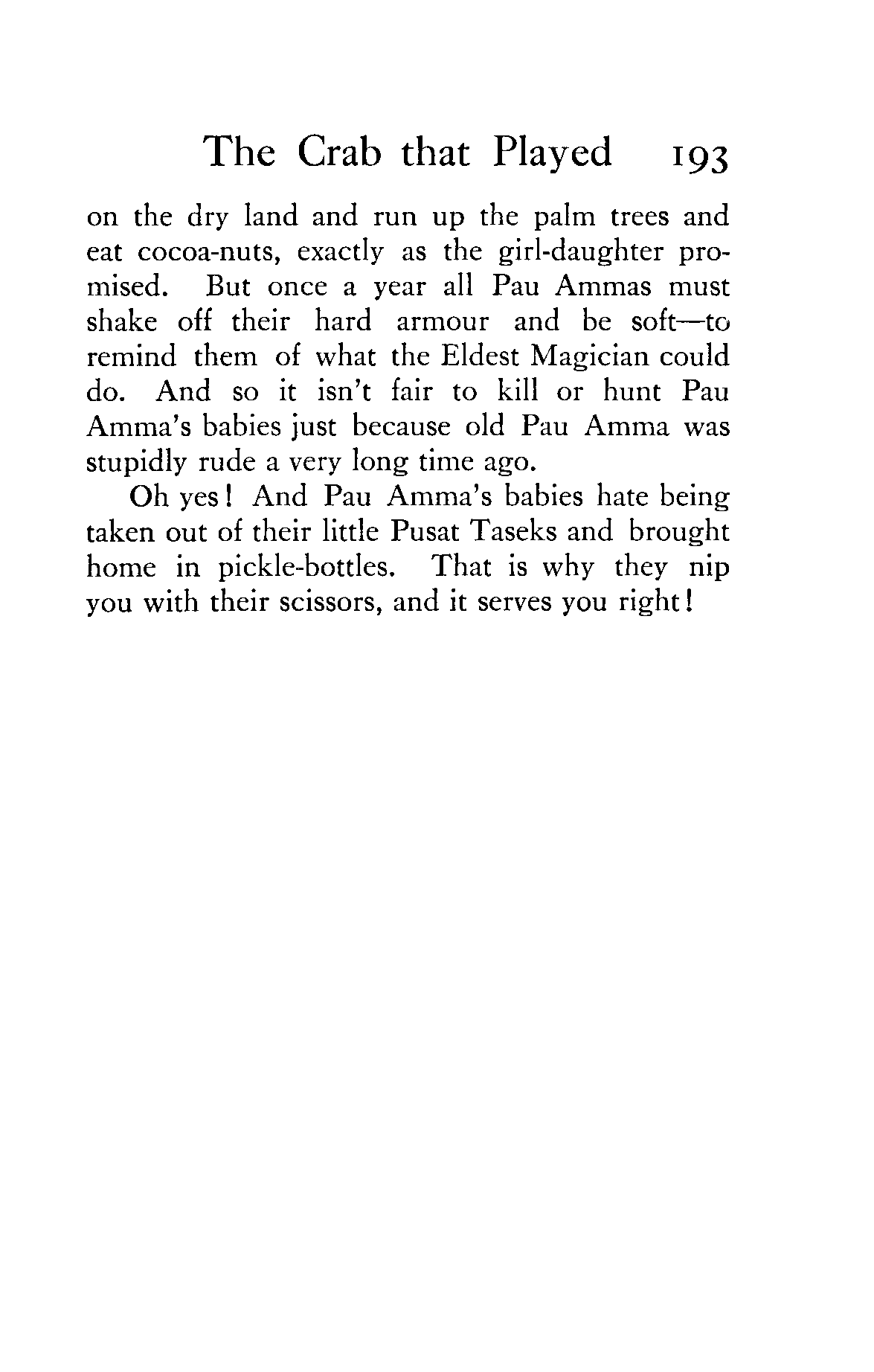 For the Mariner he was also an Hi-ber-ni-an. And he stepped out on the shingle, and went home to his mother, who had given him leave to trail his toes in the water; and he married and lived happily ever afterward. So did the Whale. But from that day on, the grating in his throat, which he could neither cough up nor swallow down, prevented him eating anything except very, very small fish; and that is the reason why whales nowadays never eat men or boys or little girls.