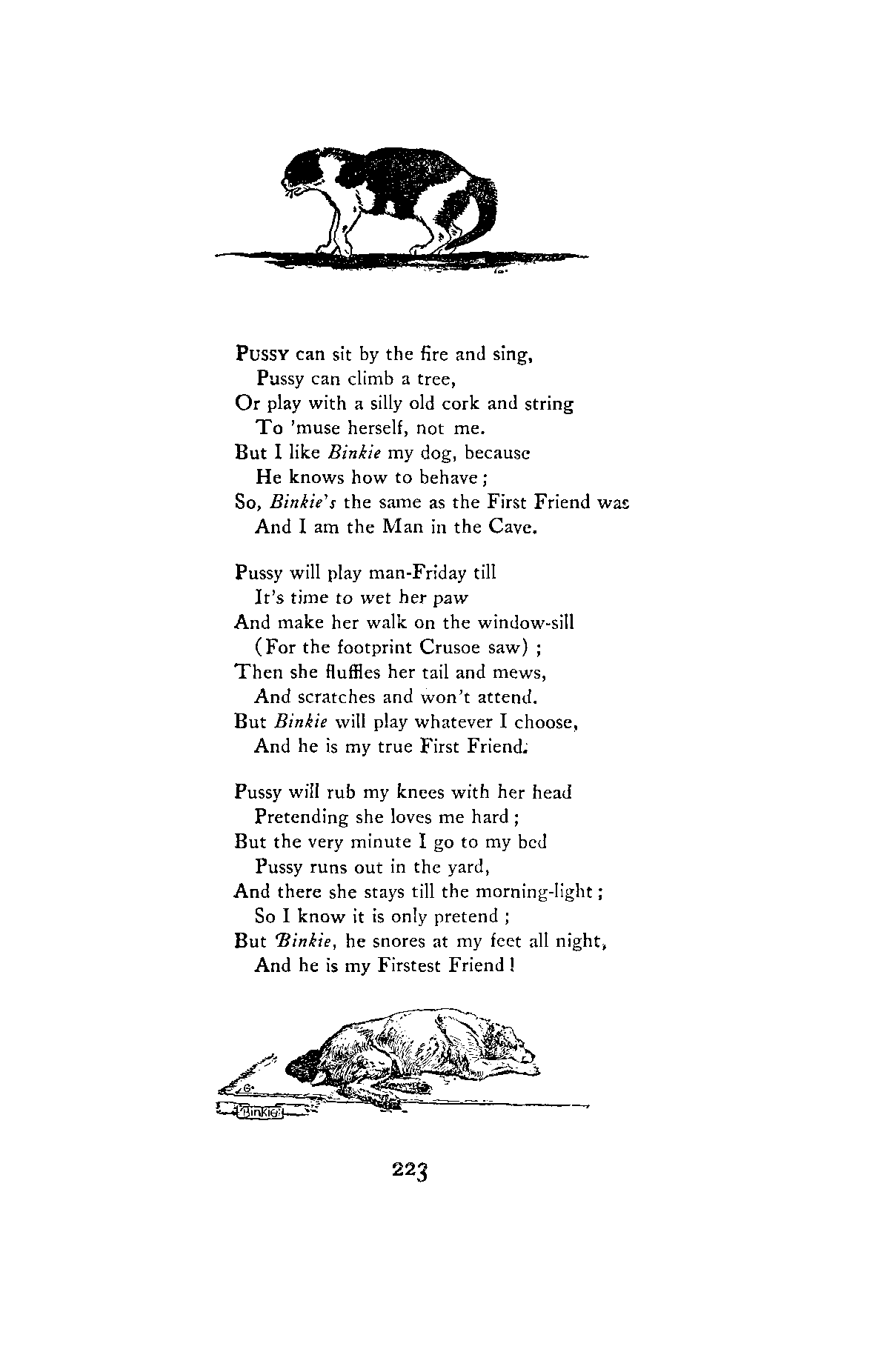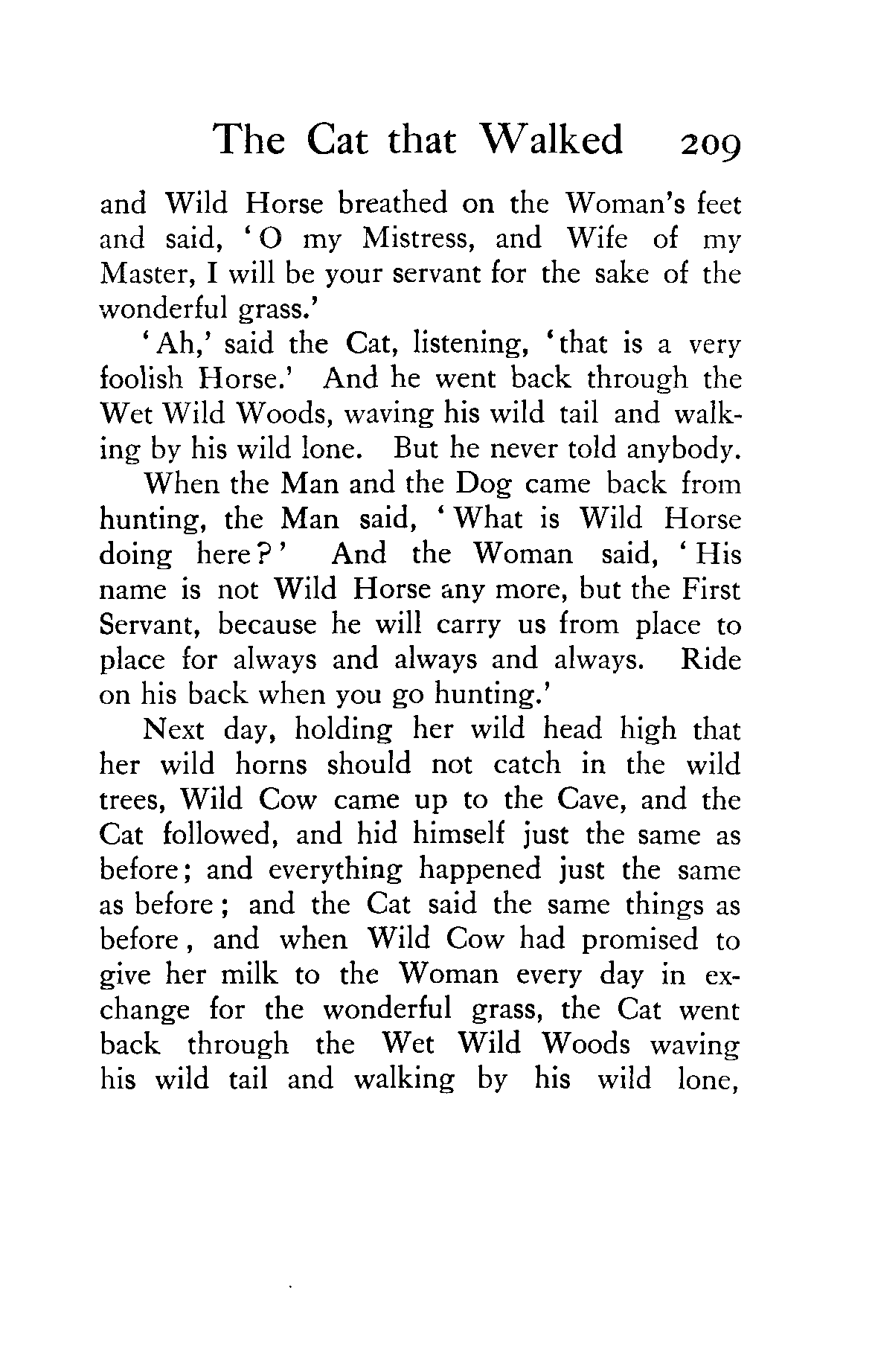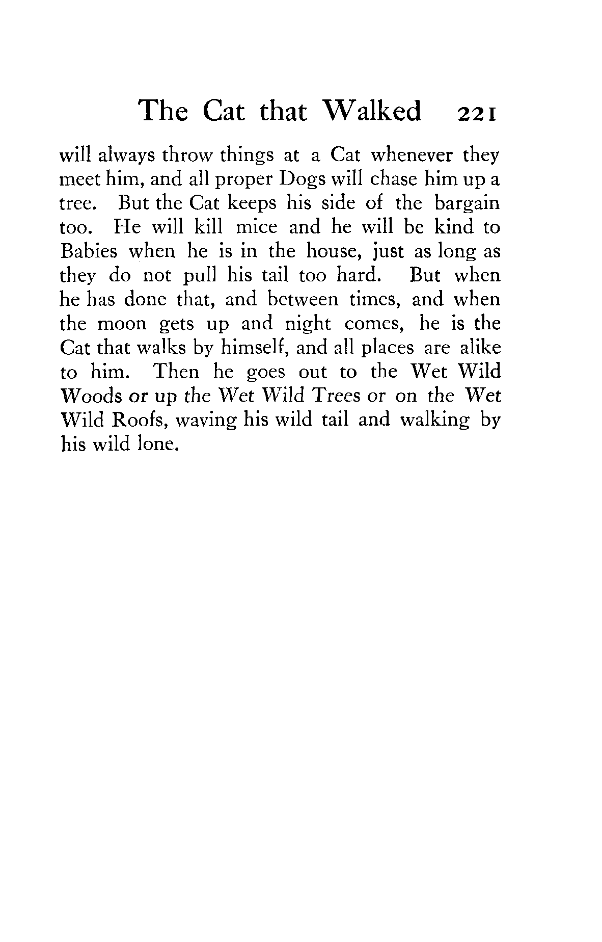 Then the Man threw his two boots and his little stone axe (that makes three) at the Cat, and the Cat ran out of the Cave and the Dog chased him up a tree; and from that day to this, Best Beloved, three proper Men out of five[221] will always throw things at a Cat whenever they meet him, and all proper Dogs will chase him up a tree. But the Cat keeps his side of the bargain too. He will kill mice and he will be kind to Babies when he is in the house, just as long as they do not pull his tail too hard. But when he has done that, and between times, and when the moon gets up and night comes, he is the Cat that walks by himself, and all places are alike to him. Then he goes out to the Wet Wild Woods or up the Wet Wild Trees or on the Wet Wild Roofs, waving his wild tail and walking by his wild lone.[223]