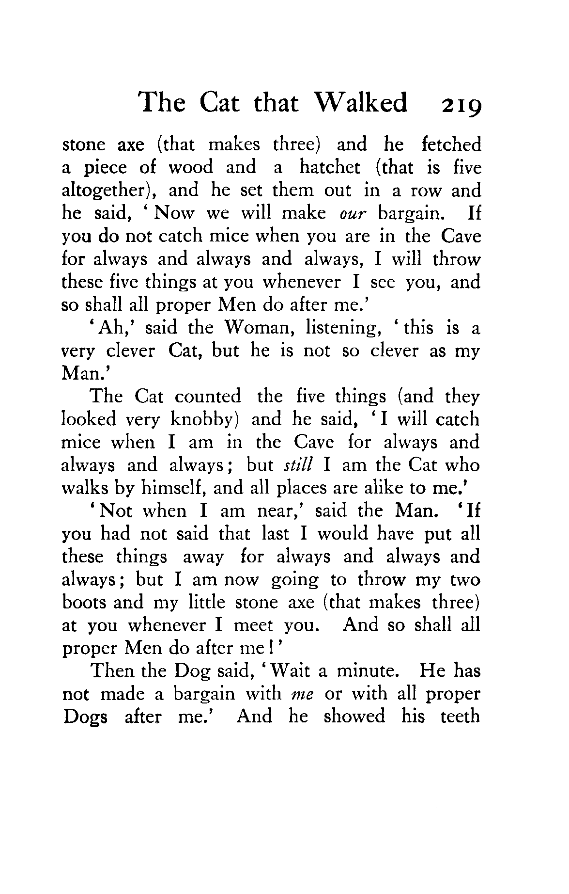 That evening when the Man and the Dog came into the Cave, the Woman told them all the story of the bargain while the Cat sat by the fire and smiled. Then the Man said, 'Yes, but he has not made a bargain with me or with all proper Men after me.' Then he took off his two leather boots and he took up his little[219] stone axe (that makes three) and he fetched a piece of wood and a hatchet (that is five altogether), and he set them out in a row and he said, 'Now we will make our bargain. If you do not catch mice when you are in the Cave for always and always and always, I will throw these five things at you whenever I see you, and so shall all proper Men do after me.'