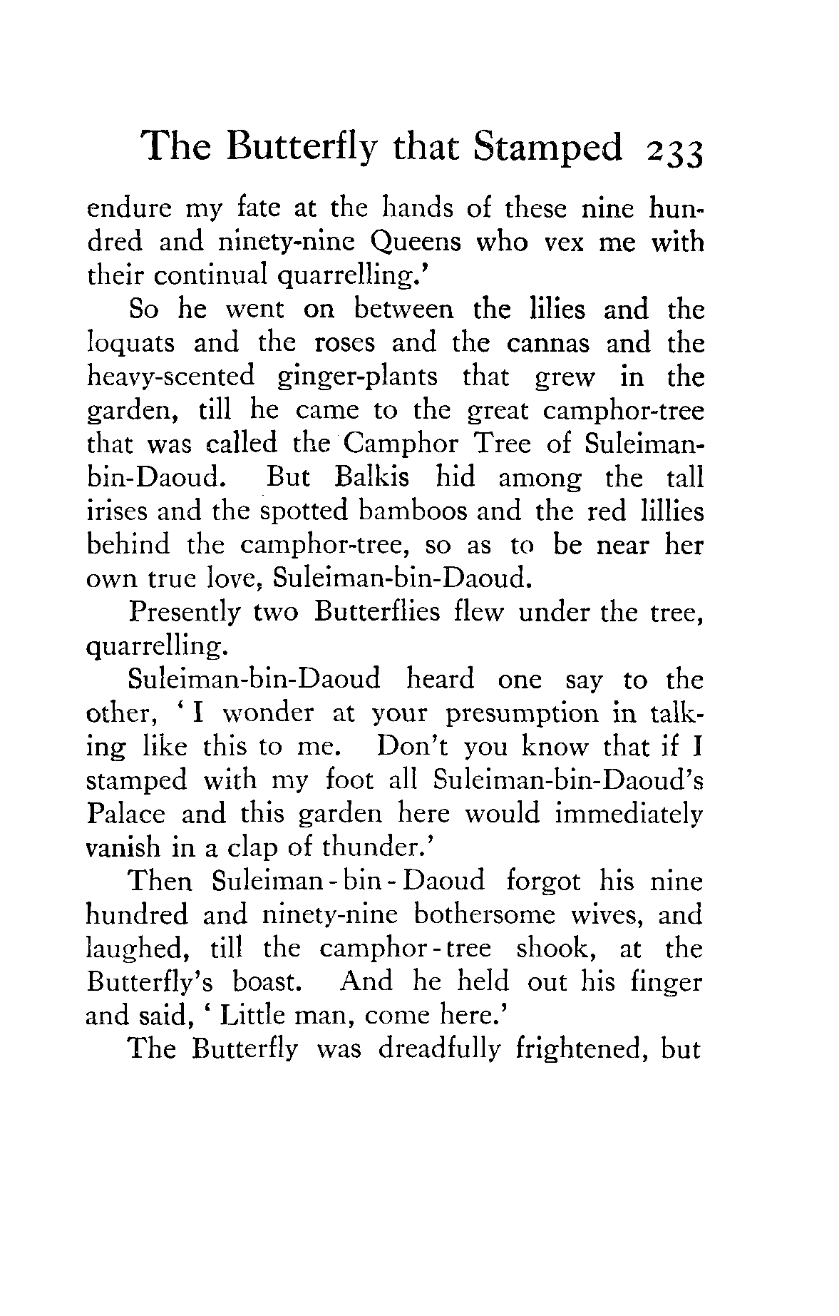 There are three hundred and fifty-five stories about Suleiman-bin-Daoud; but this is not one of them. It is not the story of the Lapwing who found the Water; or the Hoopoe who shaded Suleiman-bin-Daoud from the heat. It is not the story of the Glass Pavement, or the Ruby with the Crooked Hole, or the Gold Bars of Balkis. It is the story of the Butterfly that Stamped.[226]