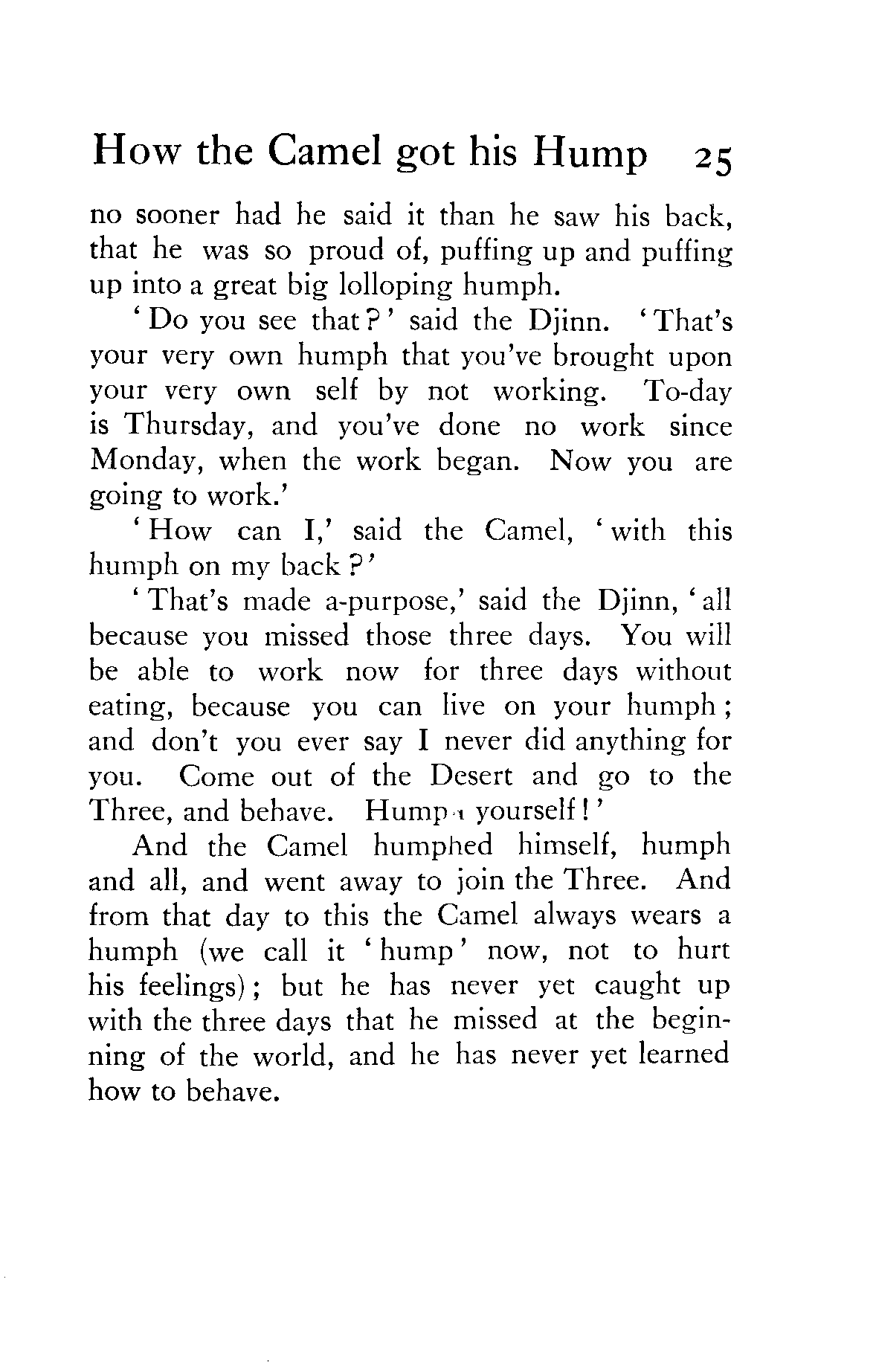 And the Camel humphed himself, humph and all, and went away to join the Three. And from that day to this the Camel always wears a humph (we call it 'hump' now, not to hurt his feelings); but he has never yet caught up with the three days that he missed at the beginning of the world, and he has never yet learned how to behave.[27]