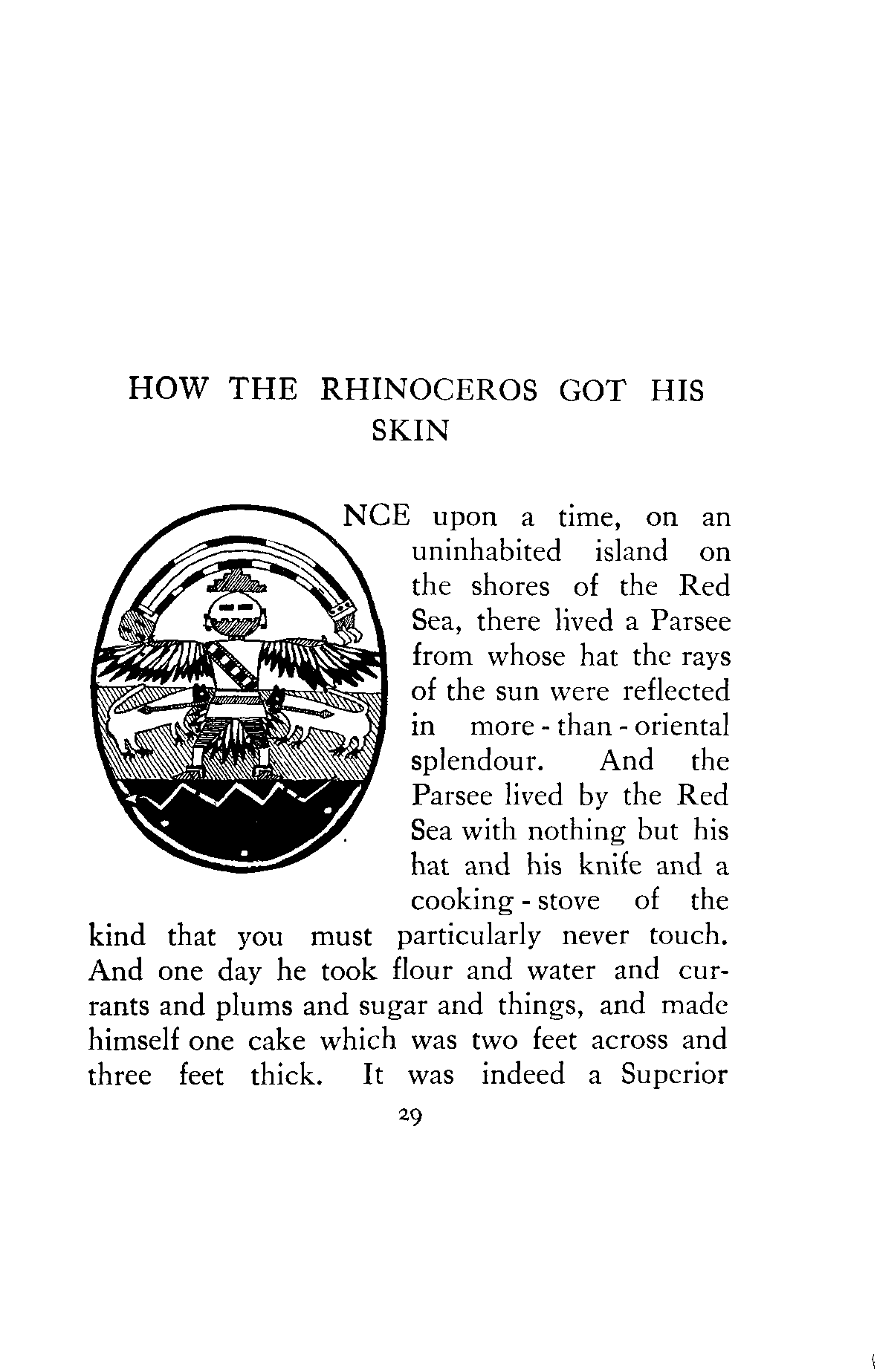 Presently the Parsee came by and found the skin, and he smiled one smile that ran all round his face two times. Then he danced three times round the skin and rubbed his hands.[35] Then he went to his camp and filled his hat with cake-crumbs, for the Parsee never ate anything but cake, and never swept out his camp. He took that skin, and he shook that skin, and he scrubbed that skin, and he rubbed that skin just as full of old, dry, stale, tickly cake-crumbs and some burned currants as ever it could possibly hold. Then he climbed to the top of his palm-tree and waited for the Rhinoceros to come out of the water and put it on.