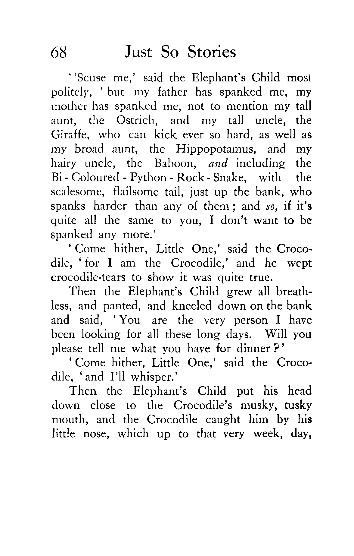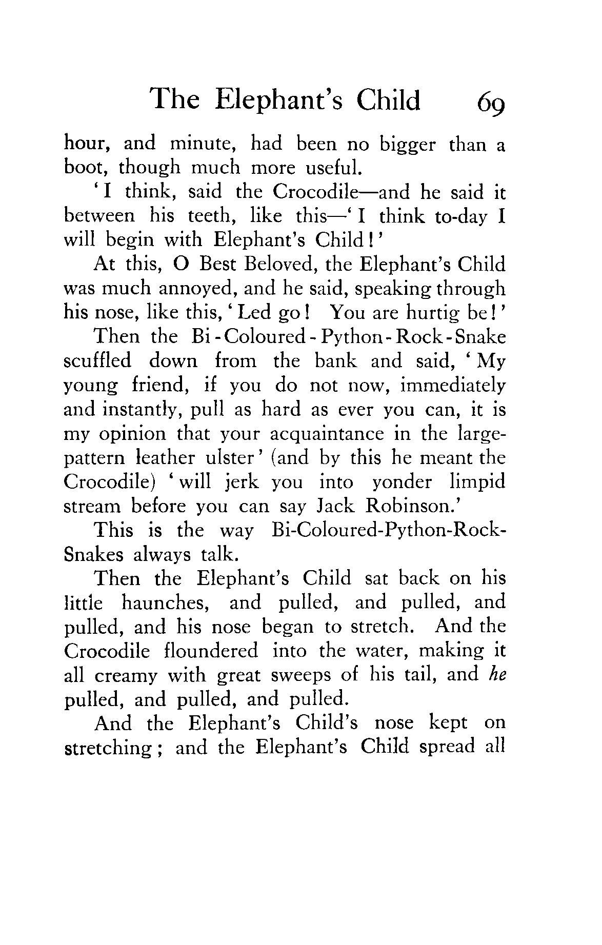 At the end of the day the Man called the Horse and the Dog and the Ox together, and said, 'Three, O Three, I'm very sorry for you (with the world so new-and-all); but that Humph-thing in the Desert can't work, or he would have been here by now, so I am going to leave him alone, and you must work double-time to make up for it.'