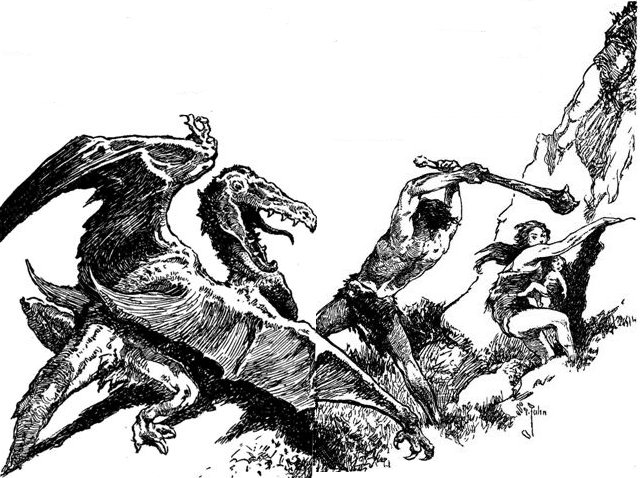 The flames of the burning city danced in the night. The air was heavy with smoke. The screams of the dinosaurs were louder, as if the great beasts were excited by the conflagration in the city of the Ogrum. Craig was vaguely aware that only two guns were firing. In spite of all his efforts to resist the impulse, he sank to his knees. The grenades continued to plunk on the roof. Only one gun was firing. Beside him, Craig saw that Margy Sharp had gone quietly to sleep. She looked like a little girl who is all tired out with play and has decided to lie down and take a nap.