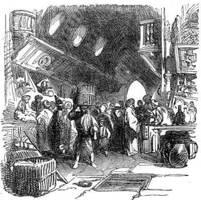 It was too late to see anything that evening, but we set off early the next morning. We first visited the pacha's palace. It faces the harbour, and has a fine view of it. We went through a small garden up a staircase, and then, on the upper floor, came to the pacha's apartments; these were very handsomely furnished. We saw beds with rich curtains of cloth of gold and silver, and large divans which were very handsome. In the dining-room the floor was of inlaid wood. The view from the balcony was very fine; but one of the things which we admired most was a beautiful table of Roman mosaic, representing all the most interesting monuments in Rome.