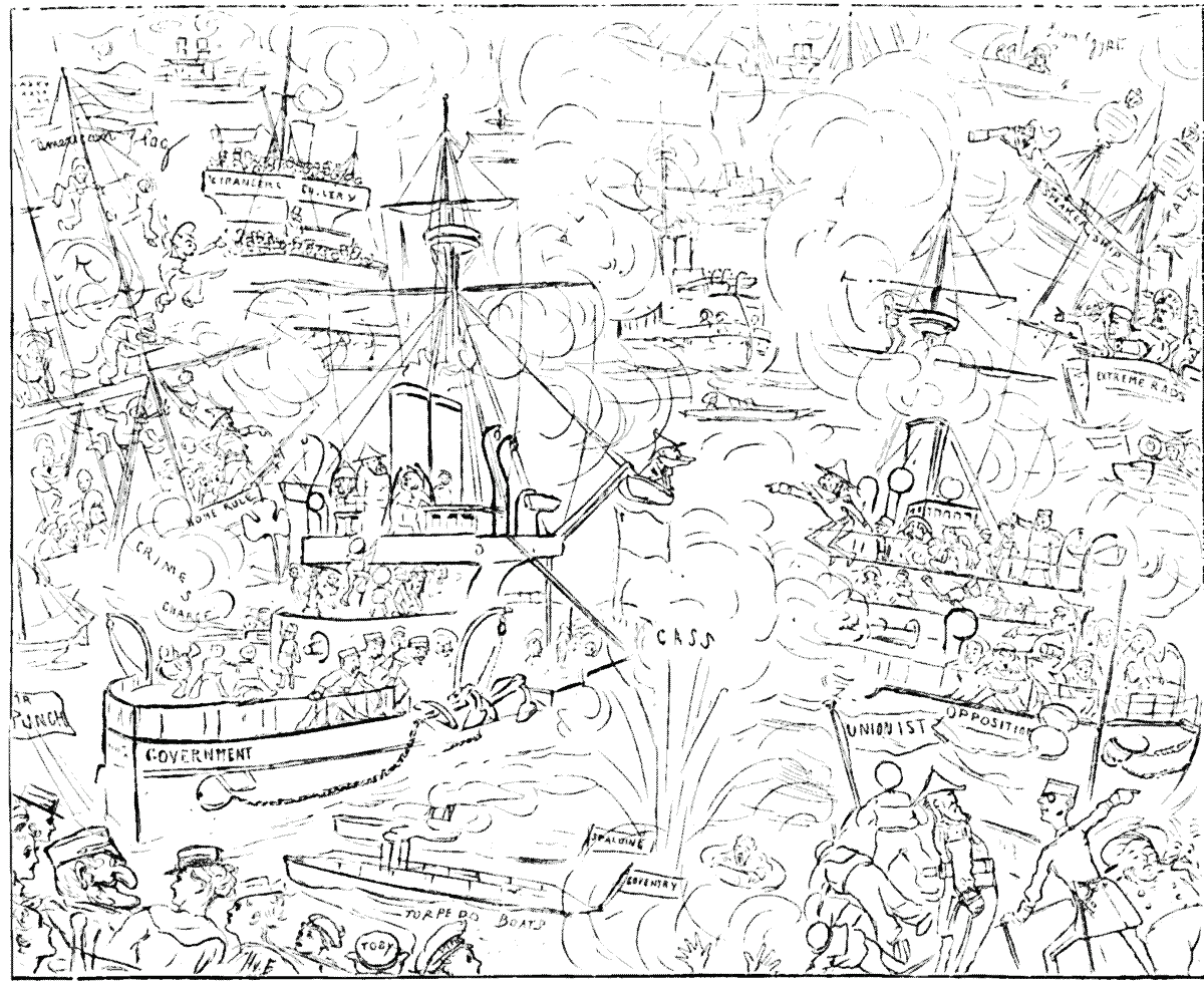 Profound sensation on Ministerial Benches. Things looking bad for Ministry lately, what with Spalding, North Paddington, Coventry, and Miss Cass. But now, Leader of House having avowed himself a Separatist, outlook black indeed.