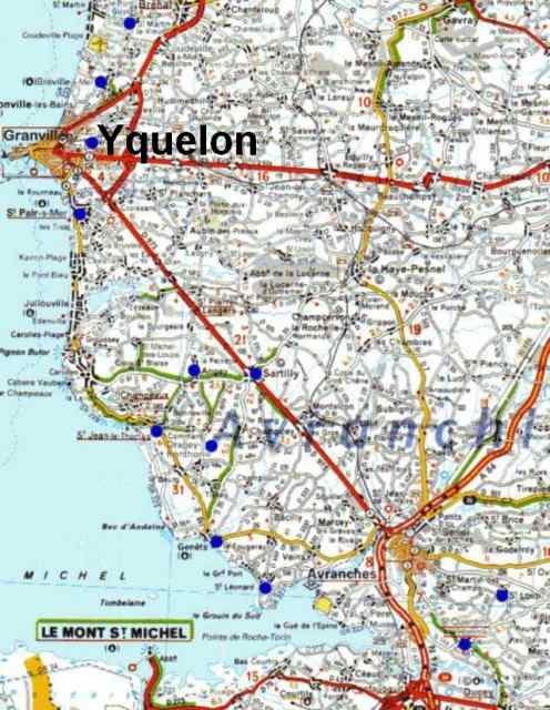 041. Yquelon. Location. The village of Yquelon is located 2 kilometers from Granville, between the villages of Donville-les-Bains and Saint-Nicolas, at the south of the river Boscq. The name "Yquelon" has Scandinavian roots and means "oak branch". Yquelon was situated on the medieval road coming from Cherbourg and going to Saint-Pair-sur-Mer before reaching Mont Saint-Michel, the final destination for many pilgrims.
