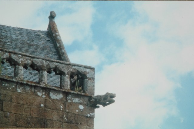 142. Genêts. A Gothic gargoyle at another angle of the balustrade hiding the base of the saddleback roof of the tower. Photo by Claude Rayon. [Claude-41]