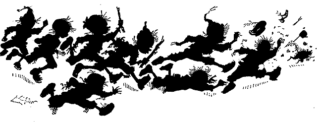XXXIV Pensez si nos pauvres gens Firent piteuse figure. Retrouvant de leurs quinze ans L'ardeur et la vive allure, Ils poursuivent, furieux, L'animal malencontreux, Qui, plus qu'eux rapide et leste, Part sans demander son reste. |
