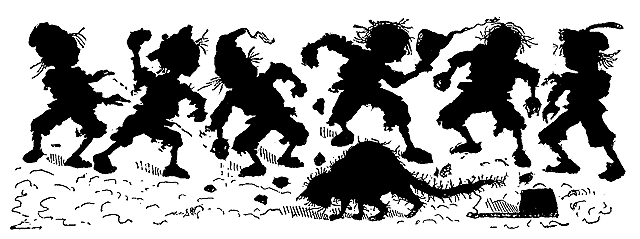 | Tout autour la troupe danse | Et force cailloux lui lance. |