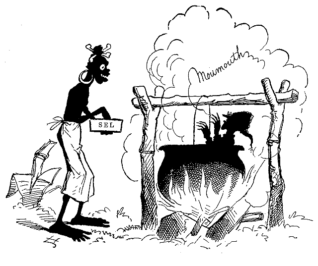 | L Bien vite Moumouth le flaire Puis, s'éloigne du ragoût. D'où peut venir ce dégoût? Ah! le mauvais caractère! |